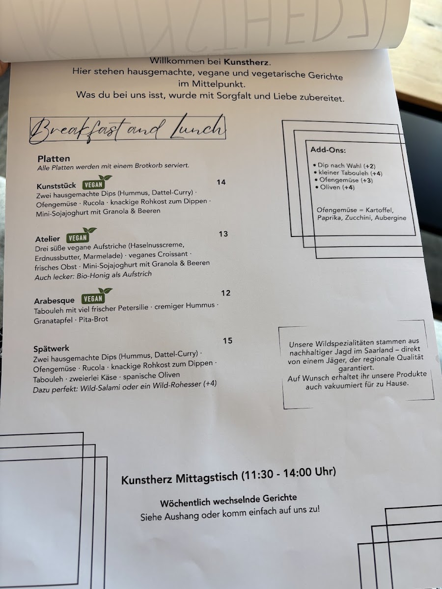 Welcome to Kunstherz, a delightful art cafe nestled in the heart of Saarbrücken at Bismarckstraße 11-15. This unique establishment is more than just a cafe; it’s a culinary haven for art lovers and foodies alike. As you step inside, you are immediately enveloped by a warm, cozy atmosphere that encourages you to linger and relax. The decor is charmingly eclectic, featuring warm tones and artistic touches that make it the perfect backdrop for your brunch outing or a quiet afternoon with a book.